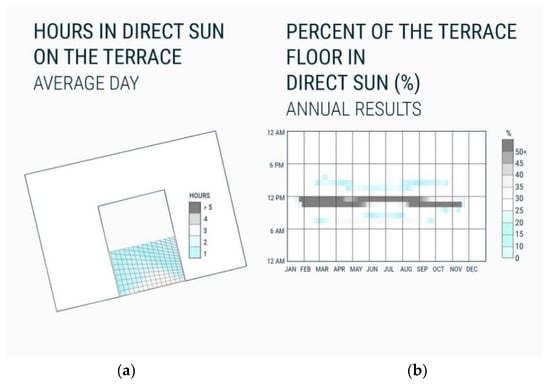 Glare analysis results. Example a terrace in Block A of G59 (a) Diagram presenting hours with direct sunlight on the terrace floor (average day). (b) Diagram presenting the percentage of the terrace floor under direct sunlight operation.