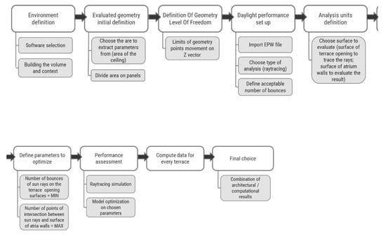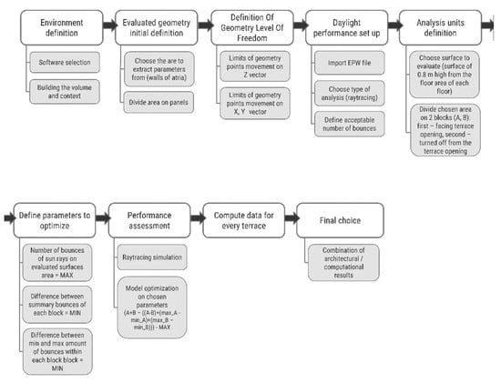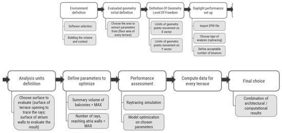 All middle latitude regions, starting at approximately 40°, are notable as receiving low levels of ultraviolet B (UVB) light waves, especially during the winter months []. In phase time, the typical choice is to compensate the required light level with artificial light systems or regulate the daylight excess with blinds and louvers introduced in the final stages of the design process. High-rise buildings located in city centers, often in already developed areas, are subject to all the aforementioned limitations. Final volumes must maintain efficient energy reference limits and fulfill the economic expectations of the financing stakeholders. Since daylighting systems are marginal, more care is taken with other solutions such as thermal transmittance with low "U" efficiency of the building’s envelope (W/m2K) and efficiency of technical systems and technologies. The present analysis is a checkpoint for an innovative design approach where daylight issues are the main parameter influencing the massing scheme. The solutions cover both direct and reflected light solutions. The research was conducted in the following phases: