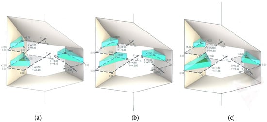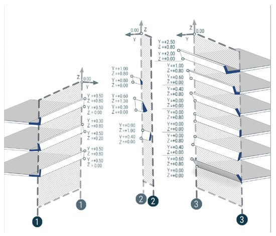 Tilted horizontal panels which bulged towards the atrium’s center at different amplitudes demonstrated the best performance. Also, “bulges” provided additional square meters on the top floors of the evaluated Block. Nevertheless, the results of the light redirection between the atrium’s walls still required improvement. To solve this issue, a central light wall system was implemented. Since the daylight source is only on one side of the building, this system had to be modified. The sidewall reflective panels and the central wall system were tested simultaneously; the proposed solution proved to be very efficient and was chosen as the final interior daylight solution. The chosen panels were set as the starting point for the optimization process (Figure 16).