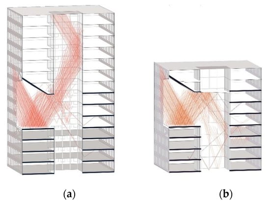 Annual illumination analysis proved that in some areas of the facade, the annual level of daylight had similar values. Therefore, the initial positioning of the sky atria was reconfigured from linear to diagonal by areas having similar illumination parameters (Figure 8). The efficiency of this solution was verified against previous assumptions and illumination levels.