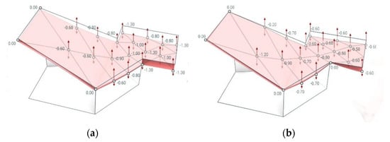 Optimization iterations of the ceiling’s form in G59. Example of the corner terrace, block B (a) initial number of rays entering the atrium: 202, final number of rays: 531. (b) initial number of rays entering the atrium: 202; final number of rays: 542 (chosen).