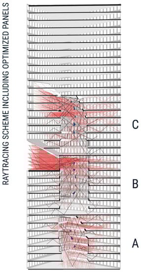 The result on the scale of all three blocks can be observed using a ray-tracing scheme. This illustrates the behavior of incoming sun rays based on a combination of optimized solutions (Figure 18). In addition, to evaluate the outcomes against the official standards, measurements were made for the annual daylight analysis and SDA levels. The simulation reflectance indexes for the surfaces were defined as: interior ceilings—0.9, walls—0.7, floor—0.4, reflective ceiling panels and central atrium panels—0.97, sidewall atrium panels—0.93. According to the planned functions, all blocks were checked for thresholds of 300, 500, and 750 lx. The illumination level for block A from the 2nd to the 6th Floor was estimated to be 300 lx upwards, suitable for easy office work activities. The first two floors of the block were designed as public spaces, so the daylight level regulations in these areas did not apply. However, the illumination level increased by approximately 6% compared to the initial parameters. Block B was divided into two parts: a 300 lx compliant zone (from 7 to 9th floor) and a computer-based work area with 500 lx illumination level (10–14th floors). The best performance was achieved in block C, which fulfilled the highest declared requirement of 750 lx in 75% of its area. The remaining 25% of the area met the threshold of 500 lx, which is sufficient for offices with computer-based work.