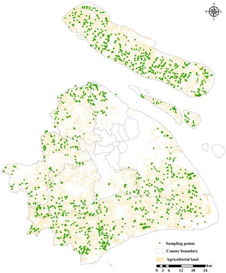 Referring to the land use map, 1848 topsoil (0–20 cm) sampling points were selected preliminarily based on a 1 km × 1 km grid covering all of the agricultural land in the study area. During sampling, the samples’ location was adjusted to acquire the cultivated soil. The distribution of the sample locations is shown in Figure 1. Detailed information about sampling, chemical analysis, and quality control can be found in previous studies [15,22]. As an overview, all samples were collected from agricultural soils using the Global Positioning System (GPS) to record the location information. Five subsamples were collected around each sampling location and then thoroughly mixed to obtain a representative composite sample. Soil samples were collected by a plastic spade, stored in polyethylene bags with labels, and returned to the laboratory for air-drying at room temperature. All operations followed The Technical Specification for Soil Environmental Monitoring (HJ/T 166-2004). In the chemical analysis procedures, soil samples were grounded to 100 mesh and then acid digested with a mixture of HCl-HNO3-HClO4. The concentrations of Pb, Cr, and Cd were measured by inductively coupled plasma-mass spectrometry (ICP-MS, TMO, USA), and the detection limits were 0.3, 0.4, and 0.01 mg/kg, respectively, while the contents of As and Hg were measured through atomic fluorescence spectrometry and the detection limits were 0.002 and 0.05 mg/kg, respectively. Blind duplicates and standard reference materials (China National Standard Materials Center, GSS-3) were also measured for quality assurance and control purposes. The recovery rate of standard samples was between 90% and 110%, and the relative standard deviation of duplicate samples was between 3% and 8%.
