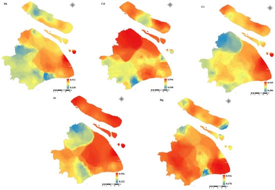 The distributions of the R2 values that represented the explanatory power of the three principal sources (i.e., PC1: natural sources (especially alluvial materials), PC2: atmospheric deposition pollution from coal combustion and transportation activities, and PC3: agricultural activities, especially the overuse of phosphate fertilizer) to TMM pollution were shown in Figure 2. Unlike the overall R2 generated by APCA-MLR, the APCA-GWR produces a set of local equations and R2 values for all points, which is beneficial for the further analysis of the spatial heterogeneity of the sources to TMM pollution. In detail, the distributions of R2 for As and Cr were similar: strong explanatory power was exhibited in the eastern mainland and on northern Chongming Island, but the explanatory power was weak in the northern mainland. This distribution pattern was similar to the PC1 distribution (Figure S2), indicating that PC1 has the strongest explanation ability regarding As and Cr. Moreover, in the southeastern part of the mainland, As and Cr also revealed a high R2, which indicated that PC3 had certain impacts on their accumulation in these areas (Figure S2). For Pb, the R2 values were high in the eastern and northern mainland but low in the southwestern mainland. This spatial pattern was similar to the combined high values distribution of PC1 and PC2 (i.e., the high value of PC1 was clustered in the eastern part of the mainland and the northern part of Chongming Island, whereas the high value of PC2 was clustered in the suburbs, especially the northern suburbs areas (Figure 2 and Figure S2)), indicating that Pb had mixed sources. In addition, the R2 for Cd and Hg revealed high values throughout the study area except for some cold spots (low explanatory power) in the mainland and Chongming Island (Figure 2). The difference between the R2 of these two elements was that high R2 values of Hg were concentrated in the suburban areas, while high R2 values of Cd were clustered in the northern areas, indicating that PC2 and PC3 were the main influencing factors of Hg and Cd pollution, respectively (Figure S2). The spatial heterogeneity distributions of each pollution source’s contribution (bp,i,j × APCSp,i,j in Equation (5) to the TMMs are shown in Figure 3. In detail:
