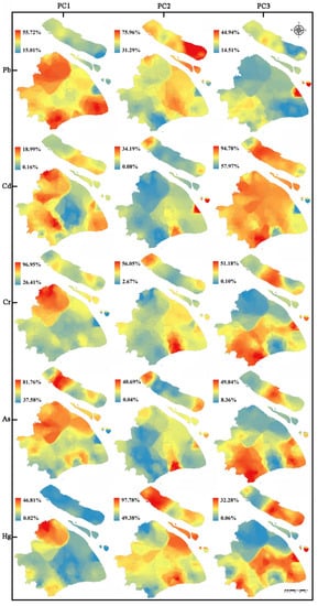 The overall contributions of each PC to the TMMs were similar between the APCA-MLR and APCA-GWR models (Table 3). Specifically, Pb was mainly attributed to PC1 (36.95% and 35.32% (mean) derived from MLR and GWR, respectively) and PC2 (52.72% and 51.46% (mean) derived from MLR and GWR, respectively); Cd mainly came from PC3 (83.86% and 82.15% (mean) derived from MLR and GWR, respectively); Cr was mainly attributed to PC1 (55.62% and 53.19% (mean) derived from MLR and GWR, respectively); As mainly came from PC1 (64.60% and 57.63% (mean) derived from MLR and GWR, respectively); and most of the Hg was explained by PC2 (82.92% and 73.61% (mean) derived from MLR and GWR, respectively). In addition, compared with the MLR model, PC3 in the GWR model showed a stronger interpretation of Cr and As, which indicates that the overuse of phosphate fertilizer and pesticides has certain influences on these elements (Table 3).