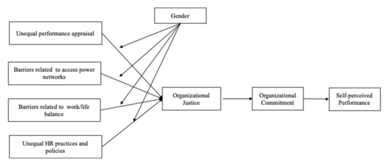 As the literature review indicates, most studies have pointed out that organizational justice perceptions influence organizational commitment and employee performance. However, few studies have examined whether the perception of unfairness due to gender barriers can influence work outcomes that have an impact on the success of organizations. There is a lack of studies analyzing the relationship between gender barriers and work outcomes through perceptions of organizational justice, and the moderator role of gender in these relationships. In order to add to the previous knowledge, the present study tests the following hypotheses: