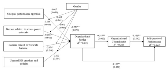 In summary, Hypothesis 1 was partially supported. H1b and H1c were supported, whereas H1a and H1d were not supported. Thus, only two of the studied barriers (barriers to access to power networks and barriers related to work–life balance) showed to be negatively associated with perceptions of organizational justice. Hypotheses 2 and 3 were supported, as employees’ perceptions of organizational justice was positively related to perceptions of organizational commitment, and this was positively related to self-perceived performance. According to the previous results, Hypotheses 4, was partially supported, as the double mediational chain proposed in the model was only supported for two of the studied barriers (barriers to access to power networks and barriers related to work–life balance). Hypothesis 5 was also partially supported, with gender showing a moderator role in the relationship between one of the barriers (barriers to unequal HR practices and policies) and organizational justice. Accordingly, Hypothesis 6 was partially supported, as the moderated mediation effect stated in this hypothesis only was supported for one out of four barriers (barriers of unequal HR practices and policies).
