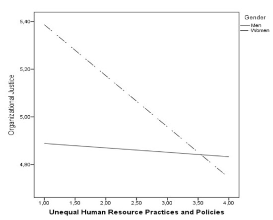 Relationship between unequal HR practices and policies and organizational justice as a function of gender.