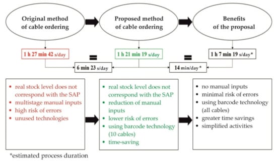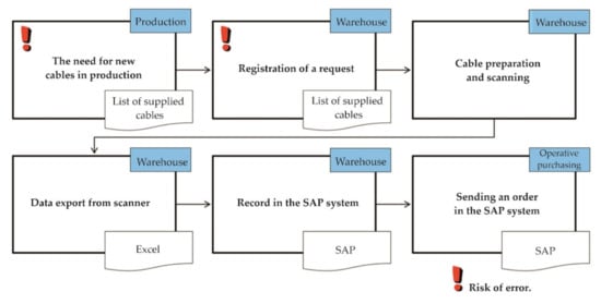 Then the employees can move the cable to the specified position in the factory. Before placing the cable in the correct place, they must scan the cable again. Each position in the factory has barcode labels. When employees stock an item, they must scan the position and movement barcode. At the end of the work shift, employees gives the scanner passes to the warehouse support manager. This person exports the collected data to a prepared database in Excel and performs a quick check of the data in the database with the help of preset macros. Based on the data from the database, it is possible to update the data in the SAP system. The SAP system then automatically evaluates the need to order cables, which reduces workload. Operational purchasing employees check the generated orders, set the date, and send them to the customer. We analyzed the main errors that arose during ordering cables. We also measured the duration of individual activities in the process. We used this data to design a new way of ordering.