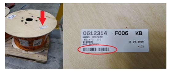 The process begins by ordering an item from production, where the production worker writes down the needed material in the specified table. Each material (cable) position in the factory has such a table. Warehouse workers check the entered requirements in production according to the schedule. They write down these requirements on a document, according to which they knows which cable to pick. In the warehouse, they first find the position of the item in the slotted rack and then load it onto a prepared pallet. Before being ready for production, workers must scan prepared cables with a scanning device. First, they scantheir personal barcodes, located on their ID cards. Then they scan the barcode of the workplace and the movement they want to make with the cable. For example, they scan the barcode labeled “STORAGE OUT” when picking up the cable. This barcode is in various places in the warehouse. It is also on a forklift to speed up the work of the warehouse employees. They then scan the barcode located on the cable reel label. This label is adhered to the cable when it is received at the warehouse. After scanning the barcode, workers still enter the amount of cable on the spool. This quantity is indicated on the packaging. Figure 4 shows the spool label with the barcode.