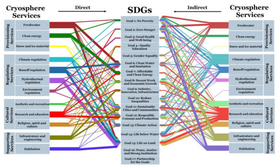 Human well-being can benefit from natural resources, both directly and indirectly [42]. The cascade effect of cryosphere services in achieving the SDG targets is considered in an approach in the Guidance Note for Lead Authors of the IPCC Fifth Assessment Report on Consistent Treatment of Uncertainties [43]. Meanwhile, the literature-based approach [44] was applied to substantiate the understanding of what benefits can be obtained from cryosphere services directly or indirectly and their link to SDGs. As demonstrated in Table S5 in the Supplementary Materials, it details the chain of causal effects from all services to 62 SDG targets. The indirect contribution of services to the targets can be made by cascading effects through a chain of interactions from the services ending up at the targets. The literature was attained from the database of Web of Science and research reports of the cryosphere and sustainable development, including IPCC AR5, SROCC, ICIMOD, etc. The search of that literature was based on the keywords included in each SDG target, and relevant words in the abstracts when none were identified by the keywords.