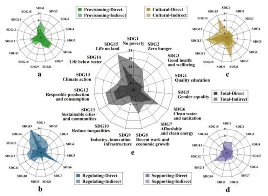 The significance of services contributions to SDGs can be categorically summarized by an index related to provisioning, regulating, culture, and supporting services, as shown in Figure 2. The regulating and cultural services have more influence on SDGs than the other two in general. This once again reflects the effects of indirect contributions that may lead to a broad impact. Meanwhile, the provisioning services provides the most significant contributions to SDG 1, SDG 6, and SDG 7, and the supporting services mostly matters to SDG 1, SDG 2, and SDG 11. In addition, the regulating services shows a strong presence in both direct and indirect contributions to SDGs, despite their different preference. In general, the provisioning and supporting services offer more direct contributions while the regulating and culture services deliver more indirect contributions.