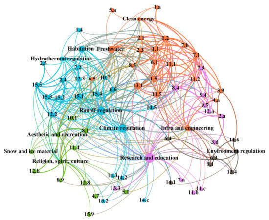 Direct or indirect interlinkage between services and SDG targets depends on the cascading effect that occurs directly on targets or via other factors. Specifically, the cryosphere services directly affects the targets in the cascading process, while possibly indirectly affecting the specific targets. This is based on the evidence identified in the critical review of hundreds of publications. The literature was employed to substantiate the understanding about what benefits can be obtained from cryosphere services directly or indirectly and their link to SDGs, with details demonstrated in the Supplementary Materials Table S5. The significance of direct and indirect linkage depends on how important the services are to the pathway impacting the targets, and is indexed at three levels, i.e., strong, weak, and none, or valued by 1, 0.5, and 0, respectively. In this regard, the synergies and tradeoffs between SDG targets [30] may considerably affect the network structure that determines roles of services in contributions to the SDG targets. The strength of interconnections is represented by the strong and weak types [29], described as 1 and 0.5, similar to the interconnections among services and SDG targets. As a result, the relationship of 12 cryosphere services (aesthetic and recreational, research and education combined) with 15 SDGs and 62 corresponding targets can be established, as described in Table S1 in the Supplementary Materials.