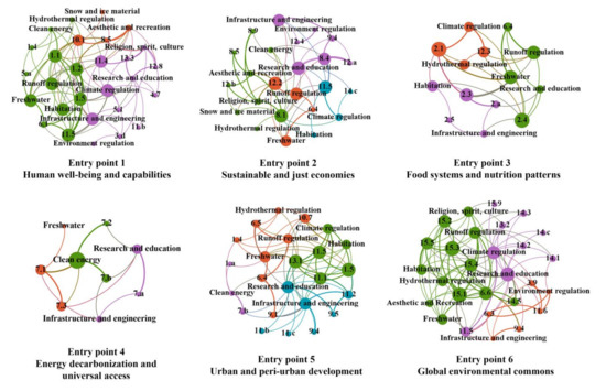 The GSDR 2019 provides a detailed overview of the dimensions of the six entry points and the main aspects as shown in Table S3. The sixty-two targets affected by cryosphere services contain human needs, economy, agriculture, energy, and society and ecology dimensions corresponding to the six entry points (Table S3 in the Supplementary Materials). Based on the network established earlier, the cryosphere services along with the targets divided into six social networks in association with SEPs (Figure 4) and the centrality of services in each SEP can be calculated as shown in Table 3.