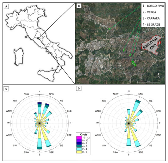 Study location in Italy (A); city of Terni and sampling areas with reference environmental control stations (ECS) and steel plant area position (B); wind-rose of prevailing winds as seasonal averages for autumn-winter, AW (C); and spring summer, SS (D) periods.