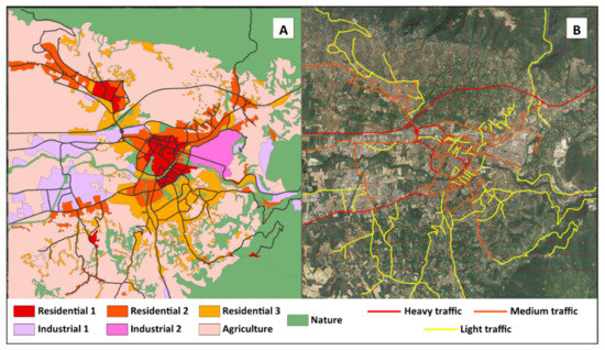 Land use characteristics of the study area. (A) GIS seven classes: Residential 1, green areas <10%; Residential 2, green areas ≃20%; Residential 3, green areas ≃50%; Industrial 1; Industrial 2, steel plant; Agriculture; Nature. (B) Traffic roads per traffic class: 1—heavy; 2—medium; 3—light.