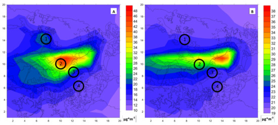Nevertheless, some differences between the model and measured data characterized two districts: Le Grazie firstly, and Borgo Rivo secondary, both for the AW period. Two separated tendencies were observed: stations located in the central part of the city, namely Carrara and Verga (Figure 3 and Figure 4, points 2 and 3) show similar averages; while for Borgo Rivo and Le Grazie districts that are farther from the city center (Figure 3 and Figure 4, points 1 and 4), the model-simulated values are lower, and there is an underestimation of the concentration values (Figure 5). This condition was noted in both districts for the AW period, but with a larger gap for the Le Grazie district. Furthermore, for Borgo Rivo, differences were observable for the periods included within WoY 01–12 and 48–52, while for Le Grazie, a longer period presented this underestimation (between WoY 01 and 15, and between 31 and 52 WoY). Moreover, in this district, for the remaining weeks, which were strictly the summer period (16–30 WoY) there was an inversion of the situation previously described: the model seems to overestimate the PM10 air concentration values as recorded by the ECS (Figure 5, graph (4)).