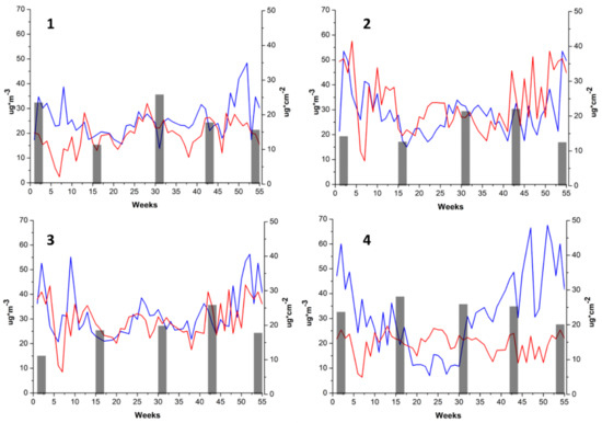 Comparison between TAPM (red line) and ECS–ARPA (blue line) PM10 values (weekly averages) in the four districts: (1) Borgo Rivo, (2) Verga, (3) Carrara, (4) Le Grazie. Overlap with PM10 deposition data (µg cm−2) on sampled leaves (Q. ilex) in five periods (grey istograms): 11 January 2012, 12 April 2012, 23 August 2012, 15 October 2012, and 15 January 2013.