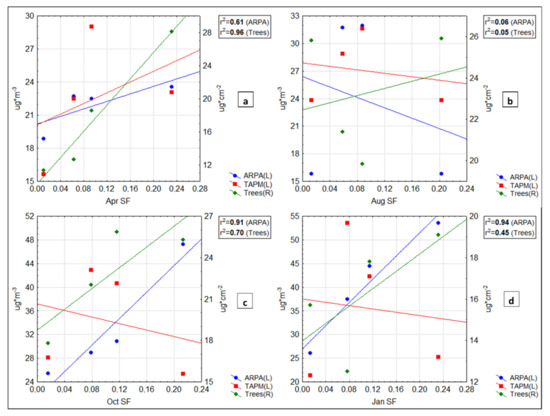 When SF was correlated to the three PM10 datasets, the spatial relationship related to the steel plant was confirmed for three periods, for ECS and Leaf deposited PM10 data, reported respectively as “ARPA” and “Trees”, and not for TAPM (Figure 6). Therefore, for correlations with TAPM, the coefficient of determination values (r2) is not shown in the graphs: values are always set below significant correlation values (r2 < 0.2).
