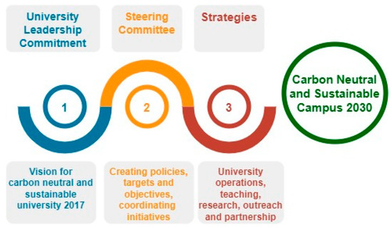 Moreover, large educational institutions including universities can be considered as small cities due to their big size, assorted populace, and the frequent multifaceted activities and operations happening in their campuses. Globally, many universities have adopted measures to limit the effects of their actions on the environment and to become more sustainable in their operations, and some have willingly dedicated their obligation towards sustainability by becoming signatories to international, national, or regional declarations and agreements like the Halifax and Talloires Declarations. The subjects of carbon neutrality and sustainability in educational campuses have become a universal consideration for university management authorities as the actions and procedures of universities have impacts on the environment [6,7,8]. Sustainable university can be defined as a higher educational institution that comprises and encourages the minimization of hostile environmental, economic, and societal impacts generated by use of their resources [9]. When compared to other sectors, the environmental effects related to universities are comparatively small, but the education sector has a prospect to play a transformative role in global change. Universities deliver poignant knowledge to all segments of society and act as anchors in the local and global communities as they are vanguard of scientific and technological advances in conducting research and educating professionals [10]. They are ideal testing grounds where sustainability solutions can be experimented and demonstrated, thus making them a Living Lab. It has already been identified that district- and campus-based initiatives can assist in sustainability and decarbonization at city-scale [11]. Thus, Universities can manifest sustainability—not only in theory, but in practice in everyday campus life. Moreover, a big agreement in the academic world is that universities should be heralds for climate friendly practices including carbon neutrality and sustainability on their campuses [12,13].