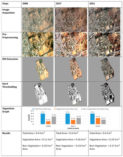 The increase in campus vegetation cover is monitored and cross verified scientifically using the image analysis technique. Vegetation cover in the NED University main campus for the last 13 years were analyzed. Figure 2 depicts methodology for vegetation cover analysis. Images of NED University for the years 2008 (before installation of wastewater treatment facility), 2017, and 2021 (after installation of wastewater treatment facility) were acquired from Google Earth Pro. The images were preprocessed to adjust brightness and contrast. The region of interest (ROI), i.e., NED University boundary in our case was delineated. Vegetation area being green in color was identified by applying hard color thresholding. The resultant image after the application of hard thresholding is a black and white image where the black portion indicates vegetation area and white portion indicates non-vegetated area. The area of black pixels region was then calculated to find the vegetated area and presented in km2. It is to be noted that the pixel size of all images is the same, which is 4800 × 2360 pixels, for the total area of NED University which is 0.40 km2.