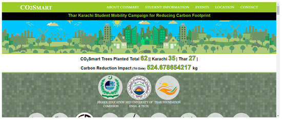 A project titled “Thar Karachi student mobility campaign for reducing carbon footprint” was developed and implemented. The project was carried out in collaboration with industry and non-government organization as partners. School students from Thar region and Karachi were selected, students spent time with the local students and their families where they learnt about their life, ethos, and societal and environmental issues. A seminar and interactive session were organized to educate the students about anthropogenic release of greenhouse gases in the atmosphere and its effect on climate. Students from both sides also planted trees at selected locations with their names on them and a tracking number. The students are now able to track the status of their planted tree in real-time (Figure 5) via smartphones and online along with the amount of CO2 sequestered through a dedicated website developed by the university (https://tksm.co2smart.neduet.edu.pk/, accessed on 31 December 2021).