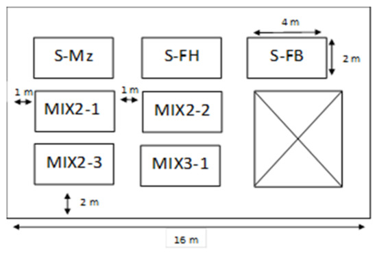 Scheme of planting arrangements. Abbreviations: S-Mz—maize (mono), S-FH—fibrous hemp (mono), S-FB—faba bean (mono), MIX2-1—maize and fibrous hemp (binary), MIX2-2—maize and faba bean (binary), MIX2-3—fibrous hemp and faba bean (binary) and MIX3-1—maize, fibrous hemp and faba bean (trinomial).