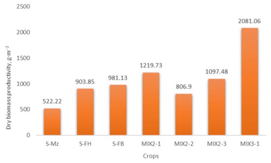 The research results of multi-crop plant cultivation in 2019–2020 are presented in Figure 3. The results show that the highest biomass yield was obtained in trinomial crop plots (2081.06 g·m−2). Compared with mono-crop yields, higher biomass yields were obtained in binary plots with maize and hemp (1219.73 g·m−2) and hemp and beans (1097.48 g·m−2).