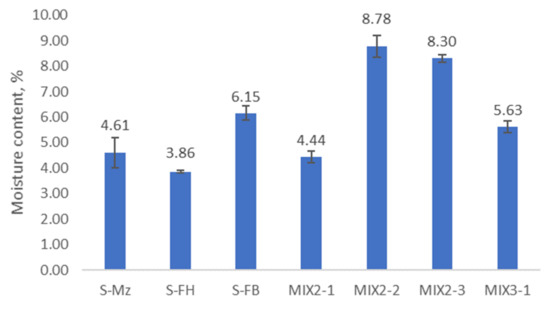The moisture content of MIX2-2 biomass pellets reached 8.78%, which was slightly higher than that of MIX-3 and S-FH (8.30 and 6.15%, respectively). The lowest moisture content was found in MIX2-1, at 3.86%. It can be stated that all investigated pellets met the requirements of moisture content for granulated biofuel (Figure 4).