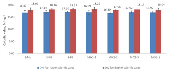 The research results regarding the calorific value of multi-crop biomass pellets are presented in Figure 5. These results show that the lower calorific value of dry fuel pellets varied from 16.80 ± 0.35 MJ·kg−1 (MIX-2) to 17.14 ± 0.57 MJ·kg−1 (S-FH).