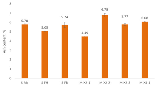 It has been noted that the permissible ash content after burning pellets of mixed biomass (i.e., non-wood biomass) is <7% [43]. That content was not exceeded when pellets were produced from all seven combinations of biomass.