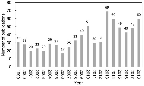 To obtain an overview of CHG research, the number of articles published annually from 1999 to 2018 is shown in Figure 1. The number of CHGs publications increased with several fluctuations from 31 in 1999 to 60 in 2018. An increasing number of journals published articles on CHGs. The average article length fluctuated slightly, with an overall average of 8.6 pages. In 1999, there were 40 references per paper, whereas in 2018, there were 48 references per paper—a slight increase over the past two decades.