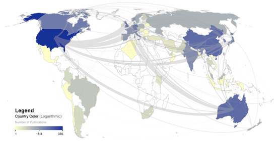 Bibliometrics was first introduced by Pritchard (1969). It has been widely used as an effective and useful tool for evaluating scientific results and research topics in specific research fields [11,12]. The performance of national contributors, institutional contributors, and authors at different levels is an important factor in understanding a field [13,14]. These studies assume that the number of publications of a country in a specific scientific subfield reflects its commitment to the state of science and is a reasonable indicator of its contribution to research and development in that field. Collaboration has intensified in recent years owing to the rapid development of scientific communication [15]. Collaboration also leads to a higher citation impact in practically all science areas [16,17,18]. Therefore, the study of collaboration patterns between researchers and regions could provide important references for other scientific researchers and policy managers.