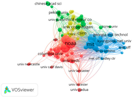 The top 10 institutions in terms of productivity are listed in Table 1. Research institutes are concentrated in North America, Europe, and Asia. National Oceanic and Atmospheric Administration (NOAA) (65) published the most articles in North America, the University of Bristol (51) published the most articles in Europe, and the Peking University published the most articles in Asia (14). NOAA had the greatest number of publications with a total of 65 papers. At the second position is the Massachusetts Institute of Technology (MIT), with 52 publications, followed by the University of Bristol (51 publications), University of Colorado (50 publications), and University of California-San Diego (UCSD, 48 publications). In terms of citations, NOAA (3107 publications) was the most prolific institution, followed by MIT (2577), UCSD, National Aeronautics and Space Administration (NASA, 2489), the University of Bristol (2357), National Center for Atmospheric Research (NCAR) (2123), and Commonwealth Scientific and Industrial Research Organization (CSIRO) (2078).