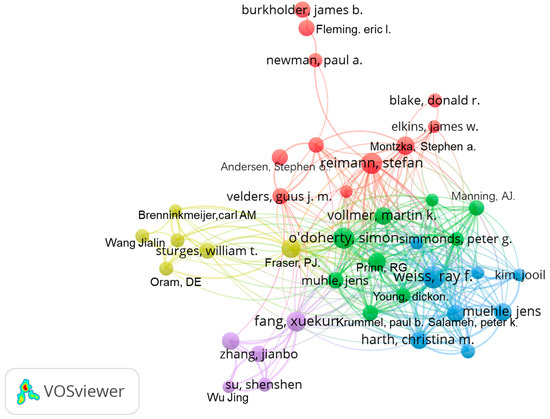 McCulloch, A was the most prolific author, with 16 publications, followed by Weiss, RF with 15 publications. The top 10 authors are listed in Table 2. There were five clusters with different colours; authors in the same cluster usually suggested that they studied a similar field and had close cooperation with each other. There are two clusters of authors who collaborated more with others: blue cluster represented by Weiss, RF, Salameh, PK, Harth, CM, Jens Mühle, etc. (the main research direction was atmospheric observation); green cluster represented by Rigby, M, O’Doherty, S, and Martin K, whose main research direction was emission estimation. The authors in the red and yellow clusters are also doing observation and emission research, but there are slight differences. The research in yellow clustering is more inclined to aircraft-based observations, and more emphasis is placed on the emission of short-lived halocarbons. The main research direction of the author in purple clustering is to establish emission inventories based on production and consumption data.