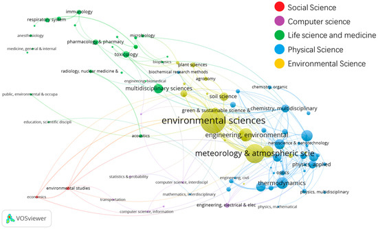 To show the interdisciplinarity and distribution of disciplines, the interdisciplinary relationship among 90 disciplines in the current CHGs field was analysed (Figure 5). In total, 90 categories and 189 undirected weighted edges are present on the map, indicating 189 interdisciplinary pairs in these 90 categories. The node size is directly proportional to the number of articles published. Thicker edge connections represent more frequent interdisciplinary categories. Environmental sciences represent the largest macro-field with 650 articles, followed by physical sciences (456 articles), life sciences, and medicine (138 articles). Environmental sciences contributed the most (248 articles, 34%), followed by meteorology and atmospheric sciences (147 articles, 20%), and environmental engineering (71 articles, 9.6%). The interdisciplinarity of the environmental sciences, meteorology, and atmospheric sciences was the strongest with 100 articles, followed by the interdisciplinary pair of environmental sciences and environmental engineering with 64 articles, and the pair of the mechanical engineering and thermodynamics with 30 articles.