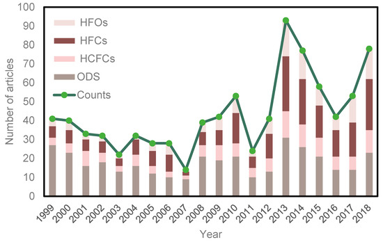 Data were obtained from the online version of the Science Citation Index (SCI) Expanded database of the Web of Science from Thomson Reuters in September 2019. (“chlorofluorocarbon*”, “hydrochlorofluorocarbon*”, “hydrofluorocarbon*”, “hydrofluoroolefin*”, ” perfluorocarbon*”, “sulphur hexafluoride”, “nitrogen trifluoride”, ”halons”, “carbon tetrachloride”, “methyl bromide”, “bromochloromethane”, “dichloromethane”, “chloroform”, “trichloromethane”, “perchloroethylene”) AND (“global warming”, “climate warming*”, “ozone deplet*”, “climate chang*”, “climatic chang*”, “Greenhouse gas”, “radiation forc*”) were searched in terms of topic within the publication years of 1999–2018. A total of 1116 publications met the inclusion criteria. Journal articles were selected for further analysis because they are the predominant article type, and the entire research objectives and results are also included in the article [20]. The “front page” was another filter condition [28]; therefore, only articles that contain search terms in the text of their “front page” (including article titles, abstracts, and keywords) were included. This resulted in 734 publications on CHGs over an 18-year period that were considered herein.