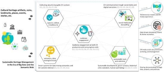 Based on the provided insights, a holistic data-driven CH approach is envisioned in Figure 1, depicting a generic strategy for engaging the audience into collecting, preserving, sharing, and managing digital heritage. Among others, the diagram projects the relation and complementarity of the eleven scientific contributions (Ci) to the different model phases. Hence, the research works included in this Special Issue are highly representative, appropriately demonstrating the main processes of the end-to-end chain. Nevertheless, future multidisciplinary research and collaborations are also highlighted and anticipated, augmenting the outcomes and the impact of the current Sustainability volume on Cultural Heritage Storytelling, Engagement and Management in the Era of Big Data and the Semantic Web.