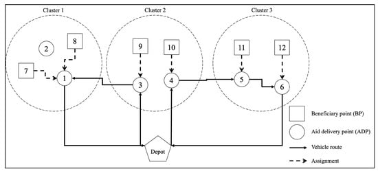 Figure 1 shows a scheme of the problem. The ADPs are the circle nodes, while the BPs are the square nodes. The straight arrows indicate the routes of the vehicles, and dotted arrows indicate the allocations from BP to their closest ADP. The dotted circles are the clusters. The first vehicle distributes aid from a central depot (pentagon node) to ADP 4 in the Cluster 2; hence, this node serves the BP 10. Next, the vehicle serves ADPs 5 and 6 in the Cluster 3 (serving BPs 11 and 12, respectively) and returns to the depot. The second vehicle serves ADPs 3 and 1 in the Cluster 2 and 1, respectively, serving the BPs 7, 8, and 9. Notice that it is not necessary to visit all ADPs (e.g., ADP 2). Moreover, the humanitarian aid could be distributed to more than one ADP within each cluster (e.g., in Figure 1, Cluster 2 is visited by more than one vehicle). A vehicle enters and leaves a cluster just once, and an ADP within a cluster could be visited by more than one vehicle if it is convenient to reduce distribution times or if the capacity of a single vehicle is not enough to distribute all aid of a cluster.