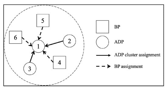 We propose an ad-hoc capacitated p-median MILP model [] to build clusters containing ADPs and BPs.This clustering method builds exactly p clusters, minimizing the distances weighted by the demand of BPs plus the distances between ADPs. Figure 2 shows the related scheme to the p-median clustering. Each BP is assigned to a single ADP, and each ADP is assigned to a cluster. Notice that having more than one ADP within a cluster does not imply that all ADPs are selected in the routing stage. In this scheme, ADP 1 is assigned as the cluster’s centroid. BPs 4, 5, and 6 are assigned to ADP 1, while ADPs 1 (self-assignment), 2, and 3 are assigned to the same cluster (or ADP 1). Notice that a cluster has limited capacity to accumulate products for serving the potential demand of BPs.