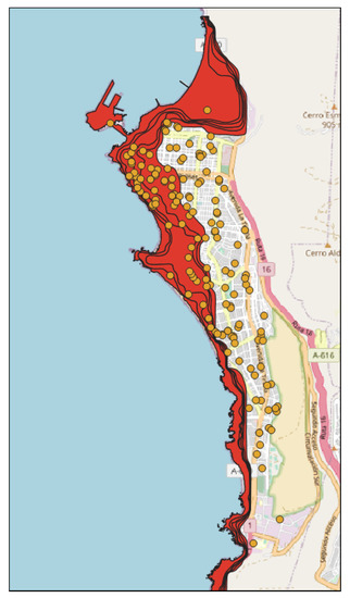 The city has 168 educational establishments, which are considered potential ADPs. Notice that 57% of them are under the flooding bound (see the red area of Figure 3, generated in Google Maps []).