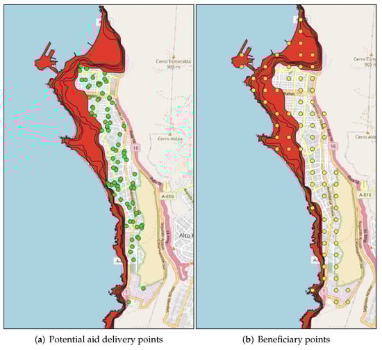 We address a case study in the city of Iquique, Chile. It has an area of 2242 km, and 191,468 inhabitants []. Iquique is a city located in the north of Chile, where there is a seismic gap that could generate an earthquake of 8.9 [] and subsequent tsunami with waves of up to 40 meters []. Consequently, intensive preparation in the pre-disaster pre-positioning phase for facility location is required to reduce fatalities and better recovery in case of disasters like earthquakes and tsunamis [].