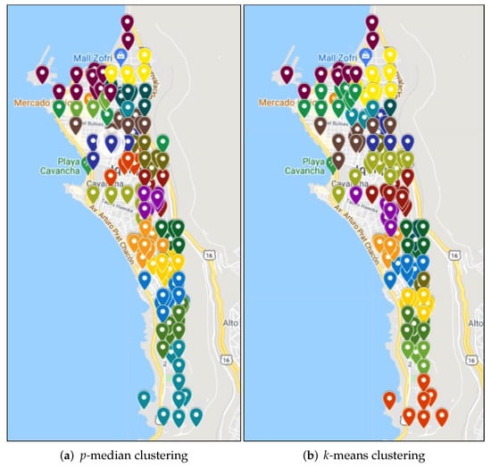 Regarding the clusterization, Figure 5 presents the result of two clusterization (18 clusters). Each cluster is represented with nodes of the same color. The first clusterization (Figure 5a) was built with the capacitated p-median model, while the second was built with the k-means method(Figure 5b). The clustering for both methods is quite similar because both use distance criteria. However, the p-median clustering tends to consider more balanced clusters in terms of accumulated demand of each one.