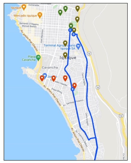 We chose the International Airport of Iquique Diego Aracena (IQQ), as the central distribution center (depot) where the most humanitarian aid would arrive in a disaster (starting and ending point for vehicles). Note that this airport is located around 40 km from Iquique’s downtown.