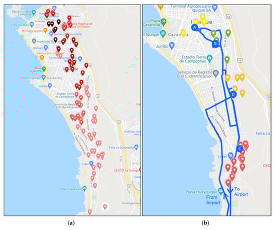 Vulnerability in routing. (a) SoVI index for ADPs in Iquique. (b) A route for three clusters considering the SoVI index.