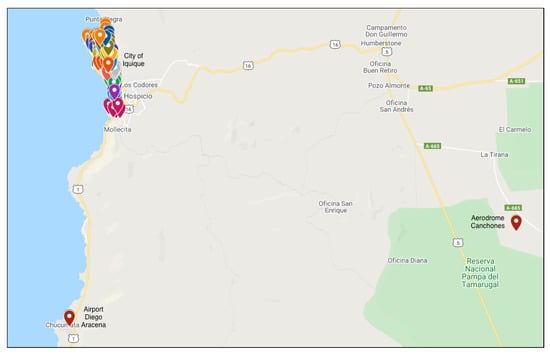- Google Maps. City of Iquique, Chile; 2022 Google Maps, Chile. Available online: https://goo.gl/maps/krxGDevUw366pDeK8 (accessed on 29 November 2021).