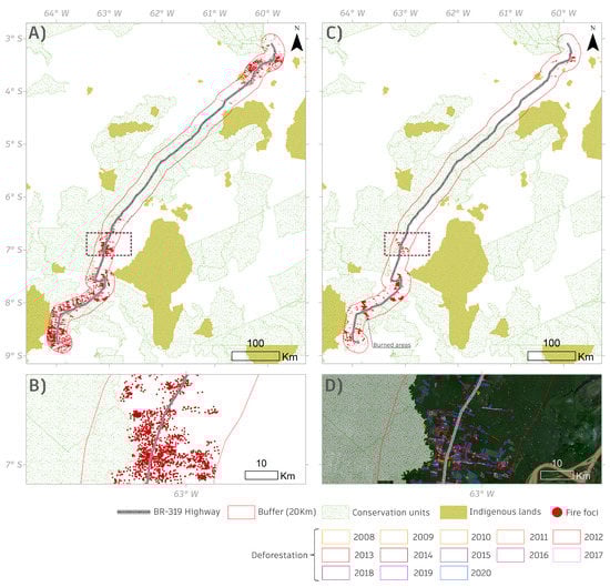 (A) Fire foci along the entire highway; (B) fires in one stretch of the highway; (C) burned areas; (D) deforestation years inserted in the BR-319 buffer with PlanetScope base map (April 2021).
