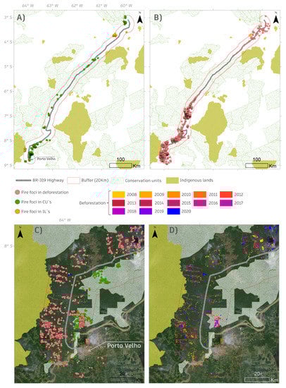 (A,B) Fire foci within deforested areas, conservation units (CUs) and indigenous lands (ILs) inserted into the BR-319 buffer (beginning of the BR in the region of Porto Velho, Rondônia); (C) PlanetScope base map (April 2021); (D) deforestation over the years studied.