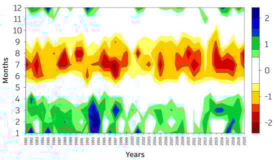 Positive SPI values indicate above-average rainfall, while negative values indicate below-average rainfall [,,]. It is shown in Figure 4 that from June to September were critical periods with minimal rainfall throughout the study period. Similarly, December to April experienced significant rainfall as compared to other months, except for the years 2010 and 2011, when there was less rainfall in the first half than in the other years. The months of May, October, and November represented the average rainfall at the site. Likewise, when comparing the annual SPI values, negative values were observed in almost all years, except for 2013, 2017, and 2019 (Table 1), which indicates a reduction in the average annual rainfall over the years.