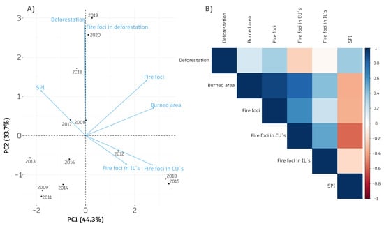 (A) Principal component analysis for the years 2008–2020 according to the following variables: deforestation (km2), fire foci in deforestation (count), burned area (km2), fire foci (count), fire foci in conservation units (CUs), fire foci in indigenous lands (ILs), and SPI; (B) Pearson’s correlation among these variables, where positive correlations are expressed in blue and negative correlations are expressed in red.